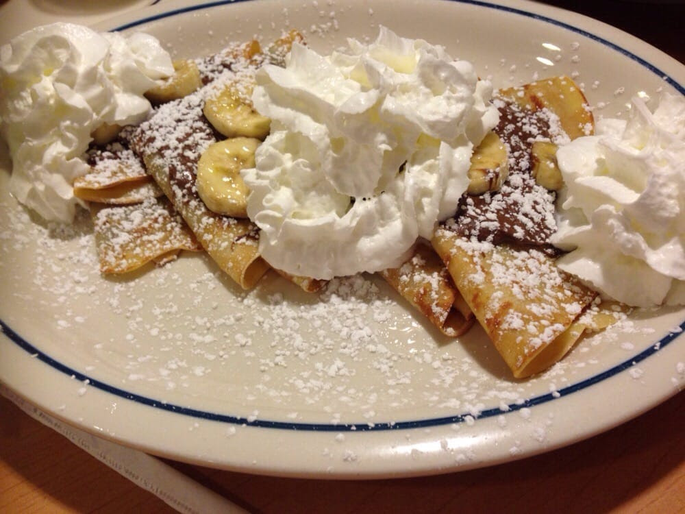 A crepe is a very thin pancake and at IHOP they elevate this dish by filling them with Nutella hazelnut spread and freshly sliced bananas.