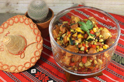 In a large pot, heat the oil and sauté the potatoes, onion, peppers and celery over medium heat