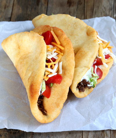 and allow the dough to cook for another 10 seconds, pressing it down gently into the oil using the tongs to ensure that it is making contact with the oil. Using the tongs, carefully turn the chalupa shell over and cook for another 10 seconds, again pressing down gently with the tongs.