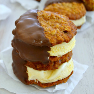 Once cookies are cool, take a cookie and place a huge ½ cup-sized dollop of vanilla ice cream onto one half of the cookie; sandwich with another cookie.
