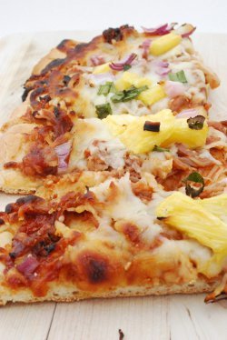 Evenly distribute BBQ pork on top, followed by pineapple, red onion, scallions and finally the cheese.